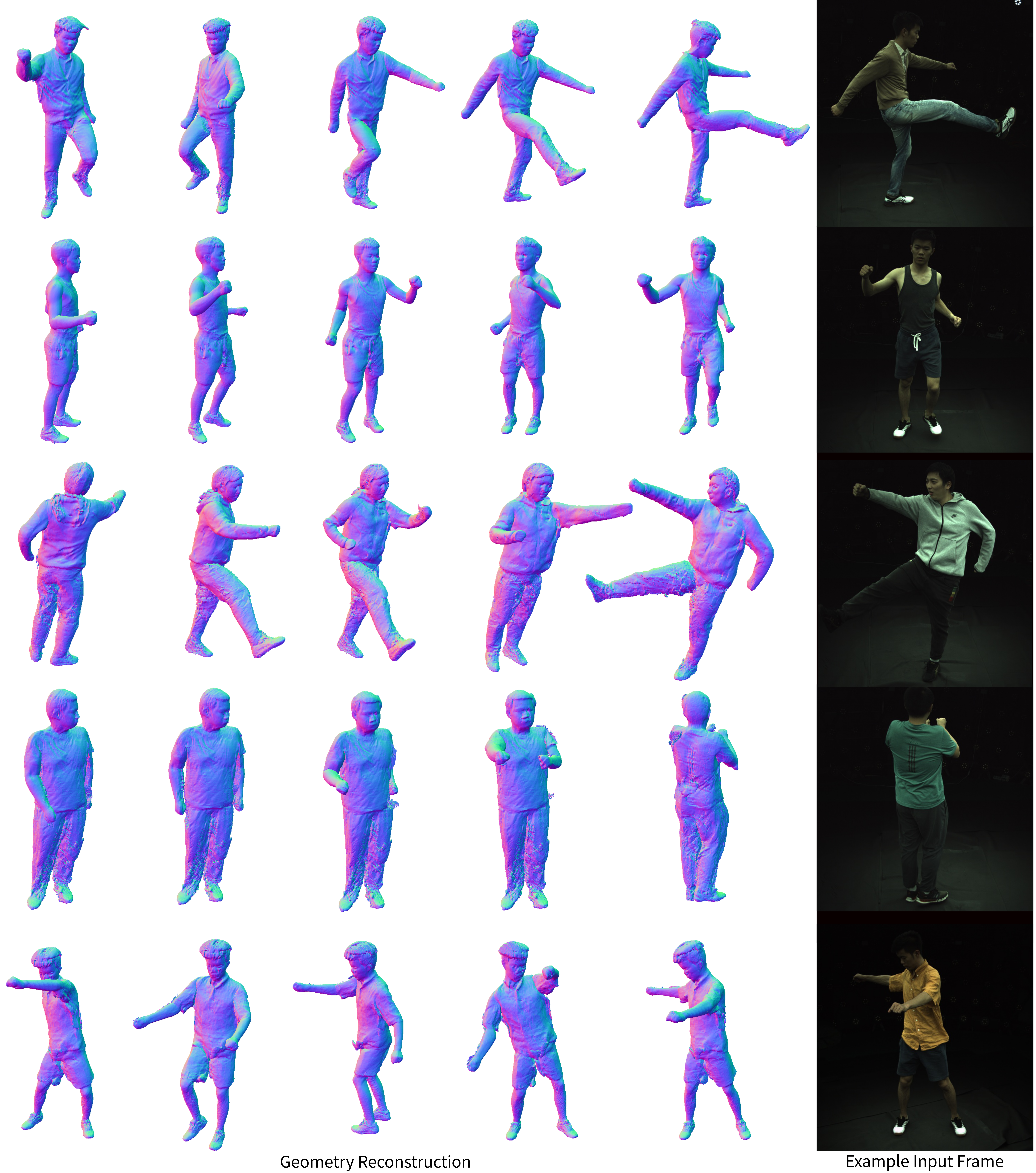 Recent techniques on implicit geometry representation learning and neural rendering have shown promising results for 3D clothed human reconstruction from sparse video inputs. However, it is still challenging to reconstruct detailed surface geometry and even more difficult to synthesize photorealistic novel views with animatated human poses.